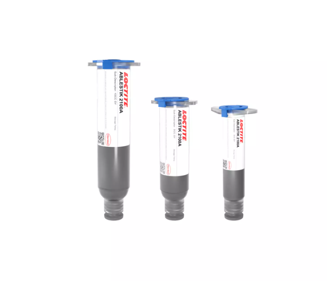 LOCTITE ABLESTIK 2100A is a silver-filled die attach adhesive designed for Pb-free array packaging. It offers high hot/wet adhesion, low stress, ultra-low moisture absorption, and excellent dispensing characteristics. The adhesive can withstand high reflow temperatures (260°C) and is suitable for die sizes up to 12.7 x 12.7 mm.
