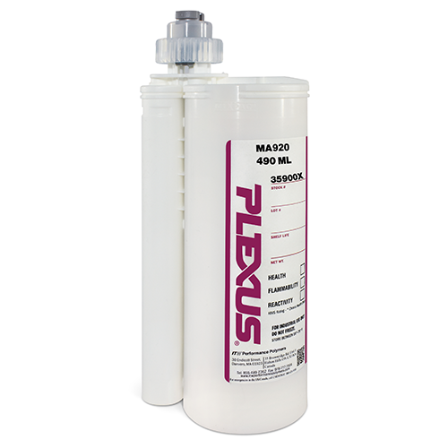 Plexus® MA920 is a low-odor, two-part methacrylate adhesive designed for structural bonding of thermoplastics, metals, and composite assemblies. It is formulated with a 10:1 mix ratio, a working time of 4 to 6 minutes, and reaches 75% of ultimate strength in 15 to 18 minutes at 74°F (23°C).